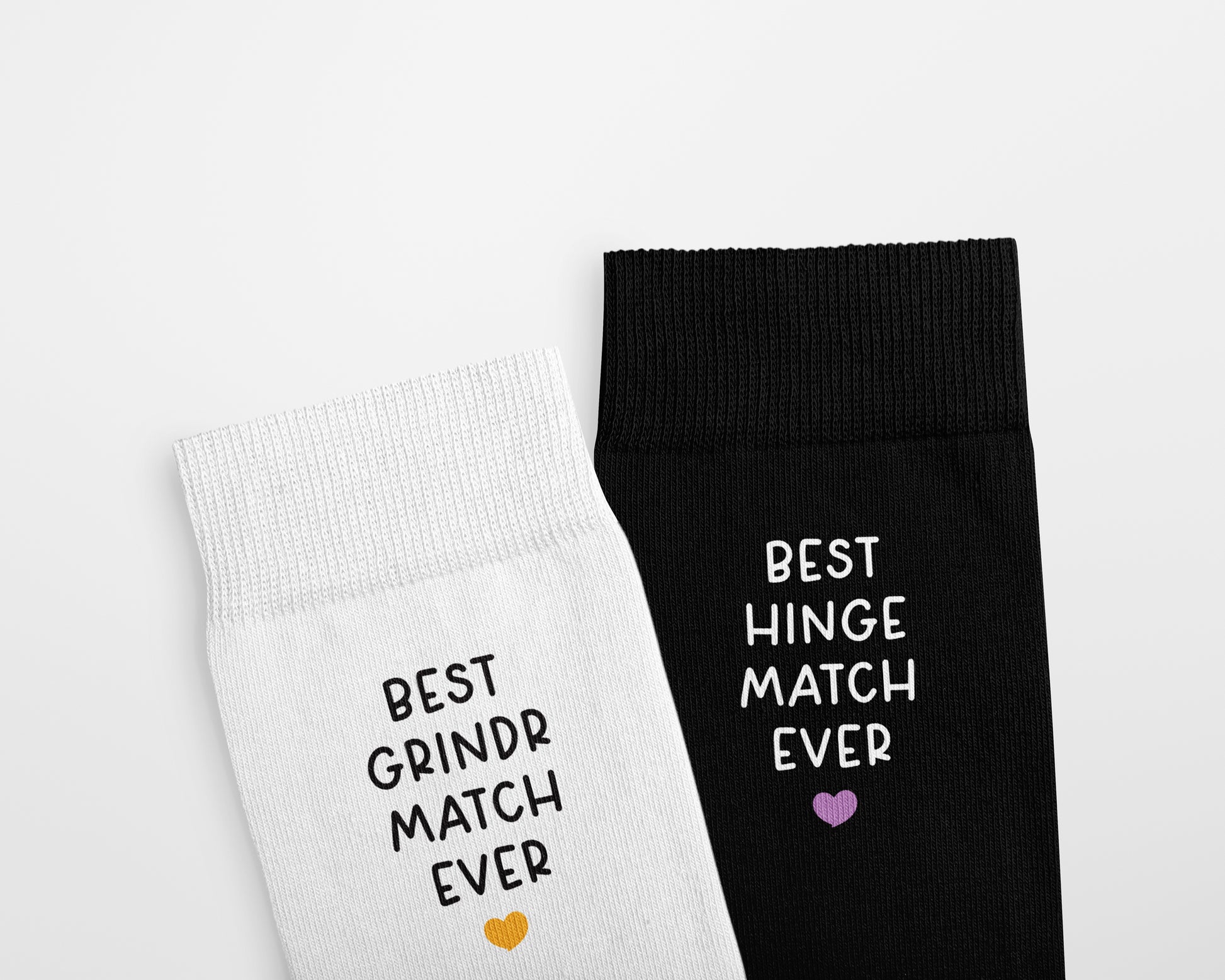 Add your unique touch with names or text like āBest Hinge Match Ever,ā āBest Tinder Match Ever,ā or even āBest Grindr Match Ever.ā These socks are as personalized as your dating app profile ā but way comfier!