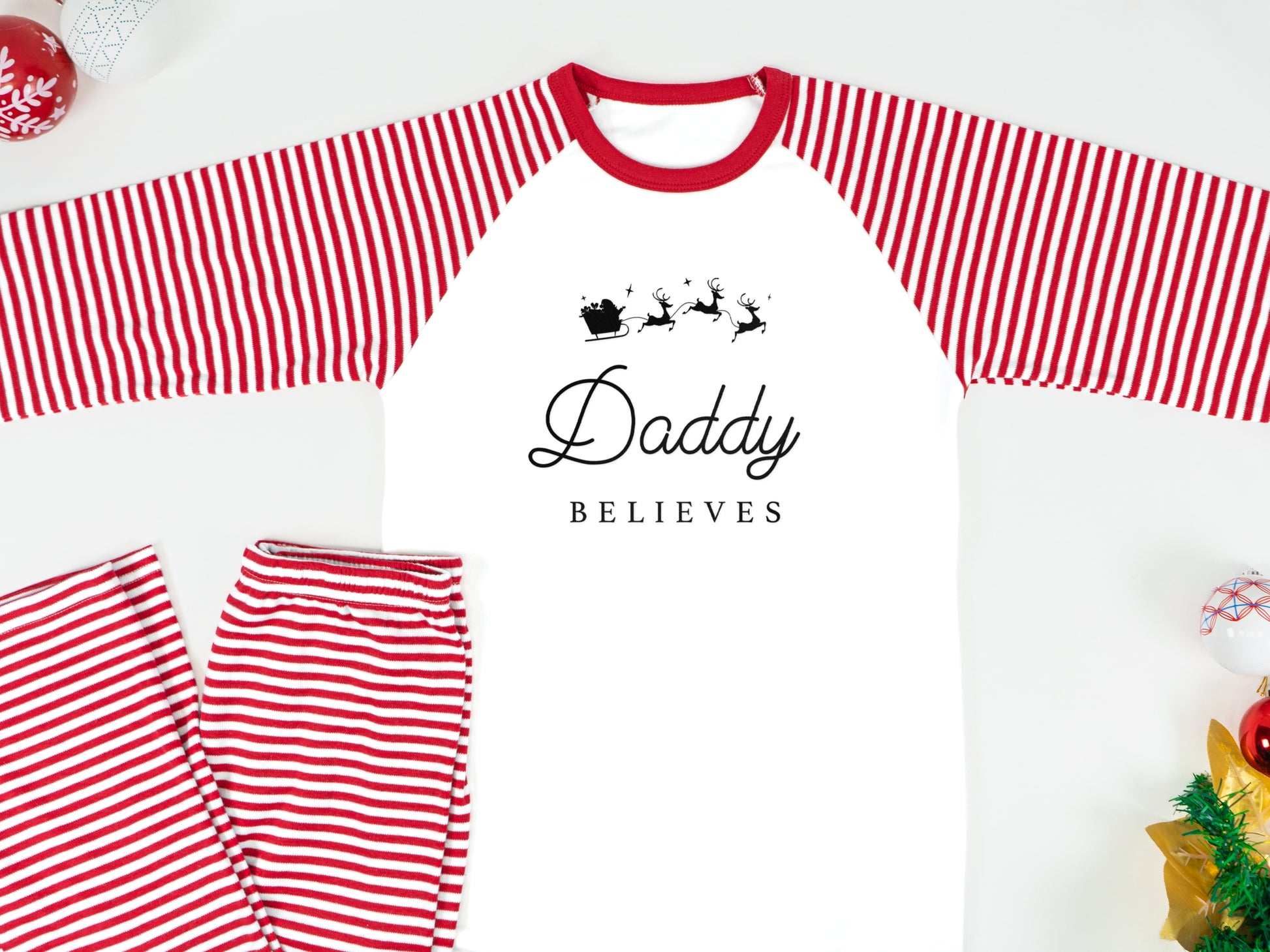 Personalised Matching Family Christmas Pyjamas – ‘Believe’ Candy Cane Reindeer PJs for Mum, Dad, Girls, Boys & Baby
